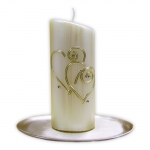 Eine aus zwei halbrunden Scheiben gefertigte Hochzeitskerze, verziert mit goldenem Herzen, Blättern, weisen Rosen und goldenen Ringen.